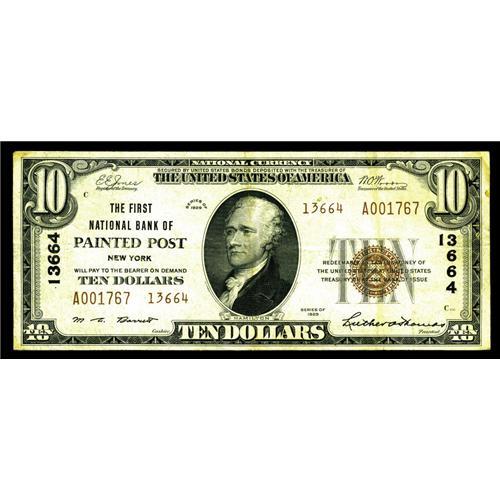 <B>Painted Post, NY</B></I> - $10 1929 Ty. 2 <B>The First NB</B></I> Ch. # 13664<BR>A nice example bearing one of the most sought after names of any issuing location. <B>Very Fine.</B></I>
