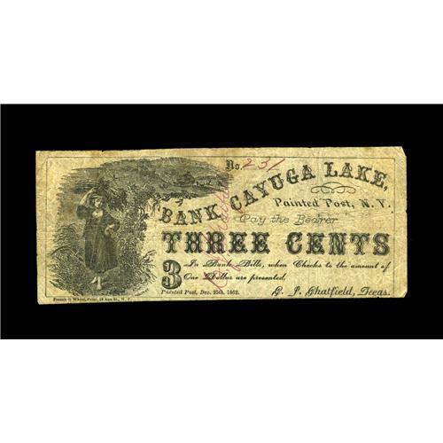 <B>Painted Post, NY- G.J. Chatfield</B></I> 3¢ Dec. 25, 1862 Harris 5<BR>Listed in Harris as C.L. Chatfield, but the note clearly is signed by G.J. Chatfield. Nevertheless, this is a scarce note, and one of the few we know of which is dated on Christmas Day. <B>Fine,</B></I> with a couple of old mountings on the back.