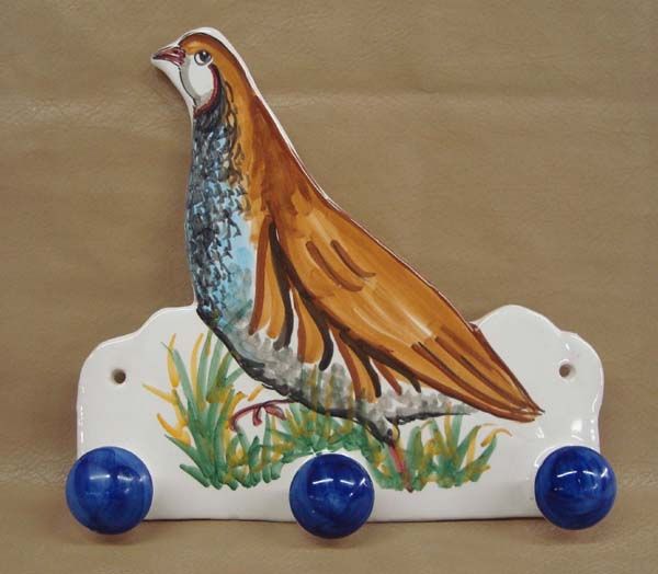 Painted Quail Ceramic Wall Hanger signed by artist P. AR Fletes on the back. Hang in the kitchen for mitts or mugs, hand in the bedroom for PJ's. Let your imagination guide you! Two pre-drilled holes for wall mounting.