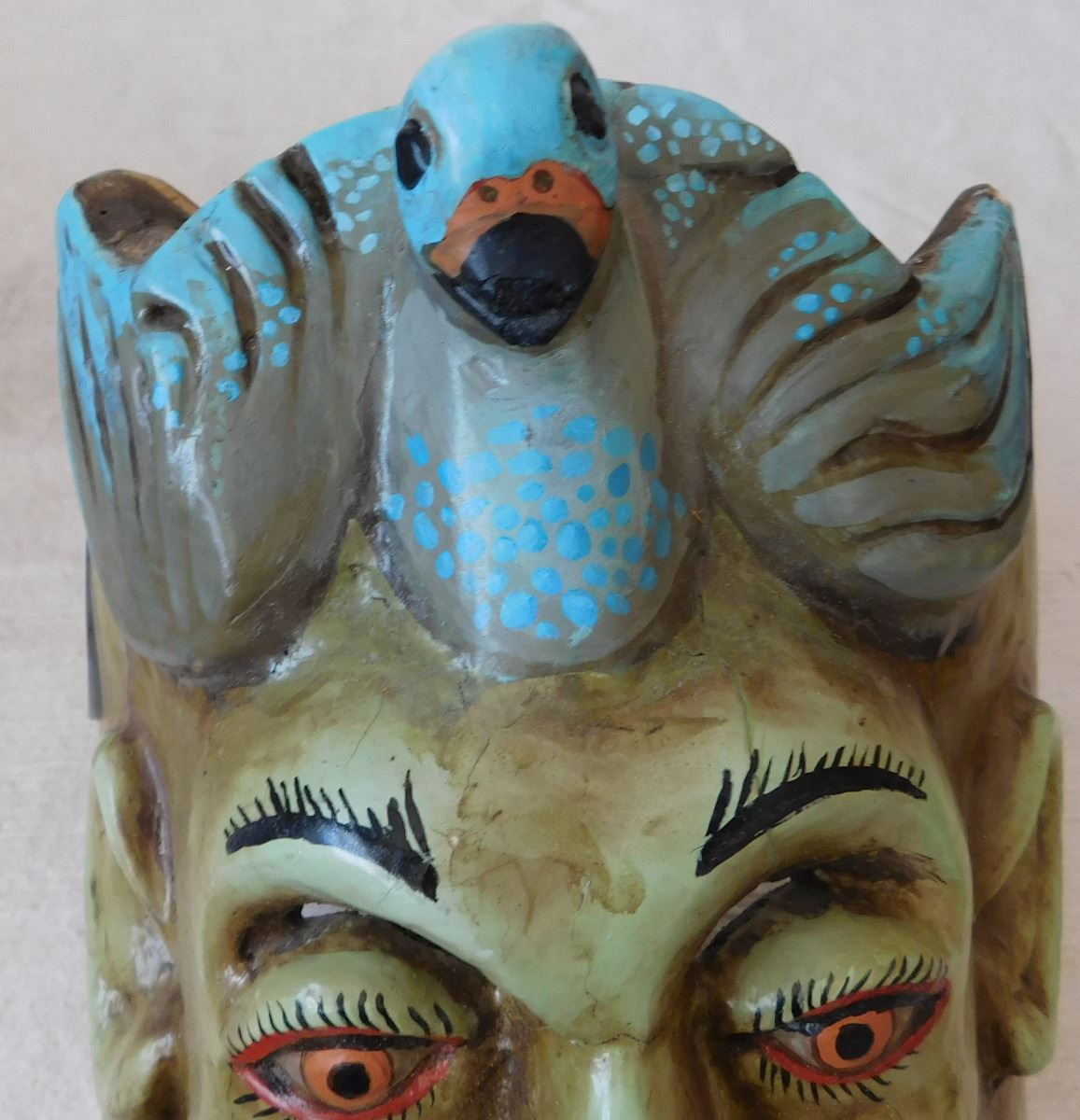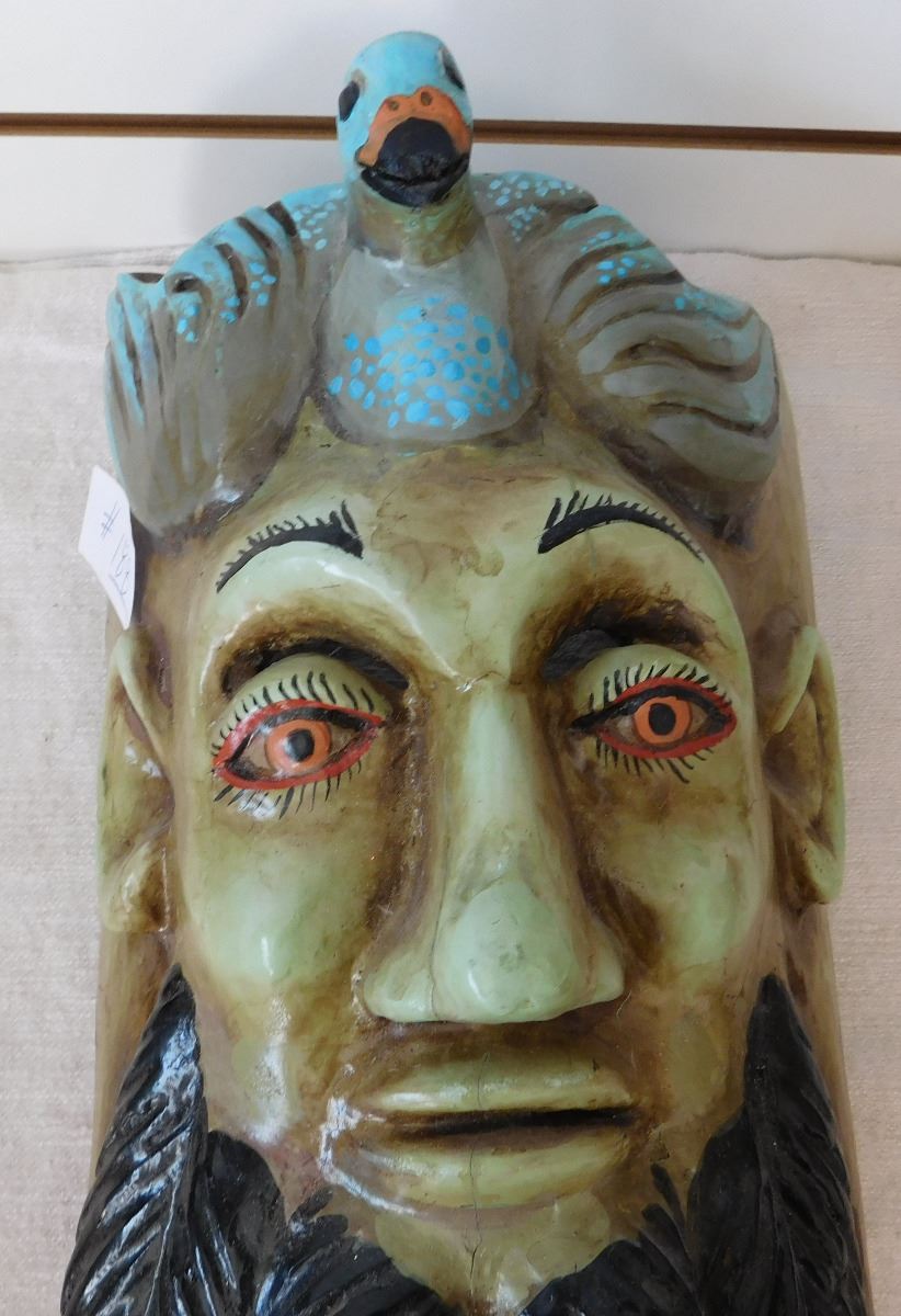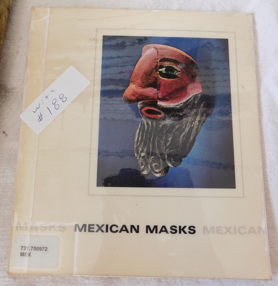 Painted Religious Mask, circa 1940. Item is made of wood and paint, book is made of paper and ink. Mask measures 22" x 7" x 6". From Mexico or Guatemala. Book included on Mexican masks. Condition: Some minor chips and wear, see images. Shipping: $30.00 due to length.