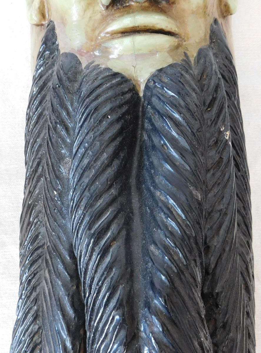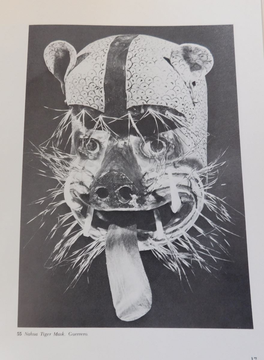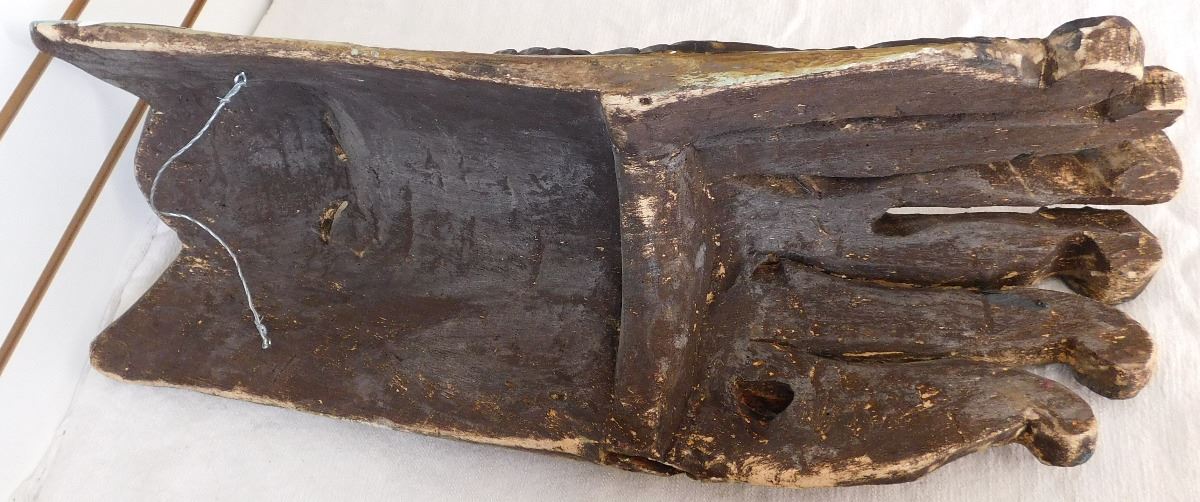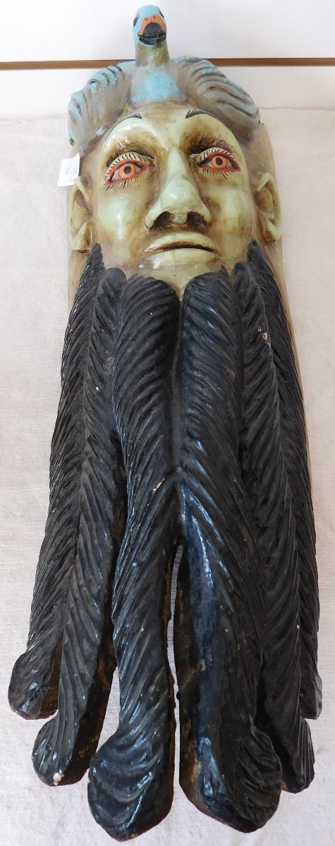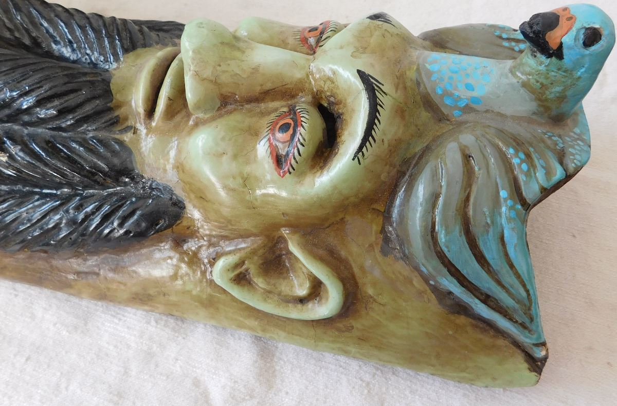 Painted Religious Mask, circa 1940. Item is made of wood and paint, book is made of paper and ink. Mask measures 22" x 7" x 6". From Mexico or Guatemala. Book included on Mexican masks. Condition: Some minor chips and wear, see images. Shipping: $30.00 due to length.
