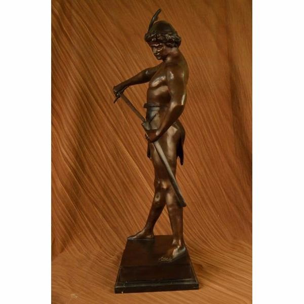 Painted Spelter Sculpture Post Pugnam. Inscribed on tablet Apres le Moisson des Lancers Lolivier Renaitra Plus Beau. Depicts classical warrior sheathing sword. Bronze dimensions with marble base: Height 35 X Width 18 inches. Weight: 40 lbs. Please Note: This is a reproduced bronze sculpture from the original molded and signed. This featured bronze sculpture is a recast after the original, and has been done recently. This 100% bronze sculpture is an abstract piece certain to be a conversation piece.