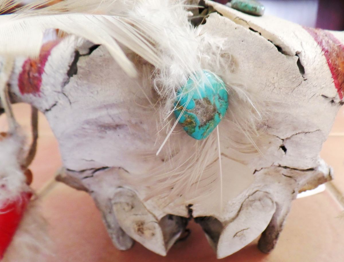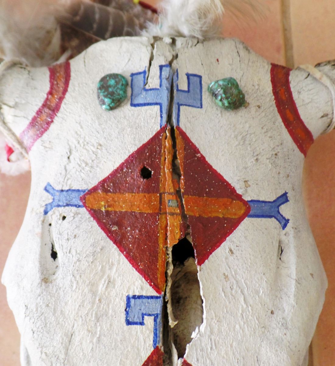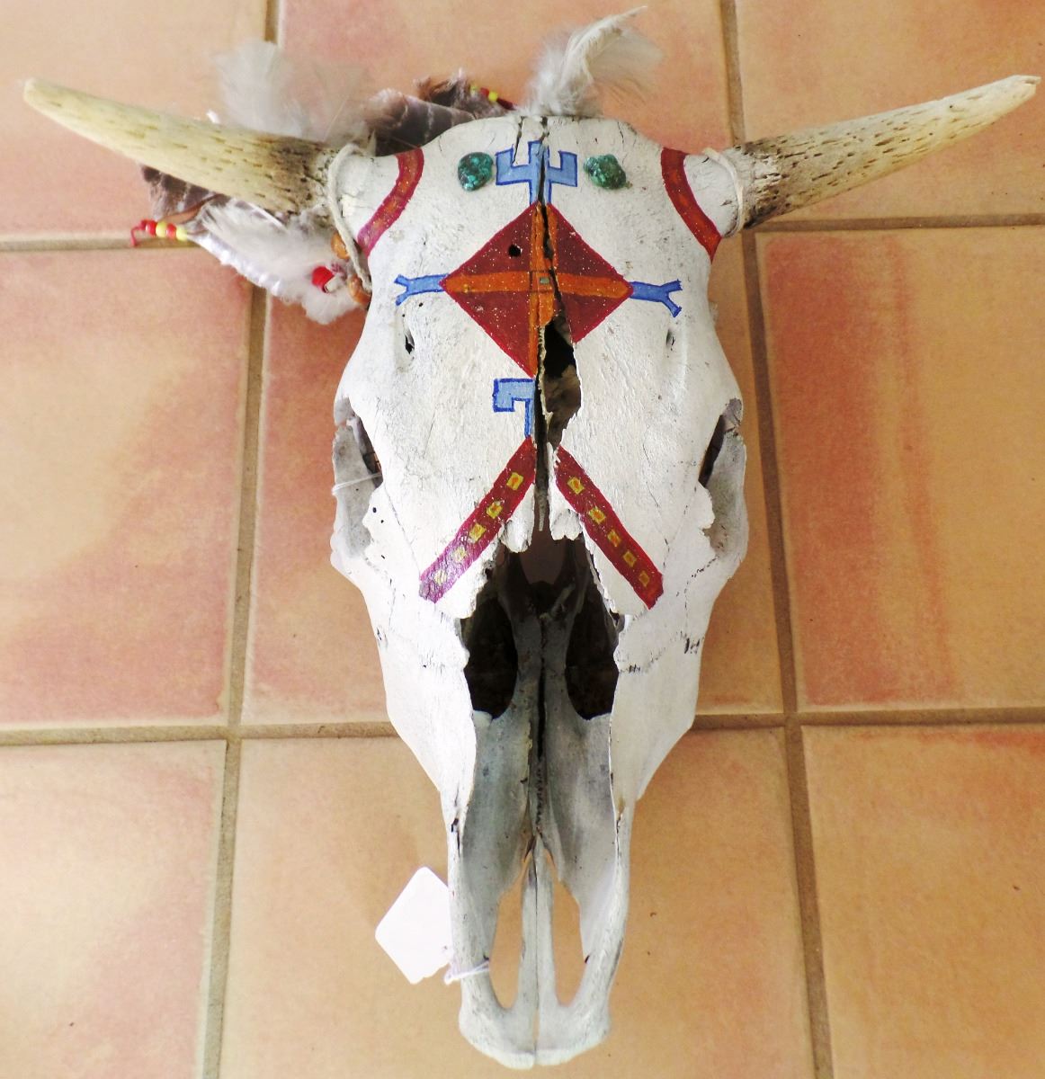 1970's painted steer skull with turquoise, feathers, paint and cow bone, possibly Apache Decorations. Conditions: There are some chips and cracks, see pictures. Shipping $50, requires double-box.