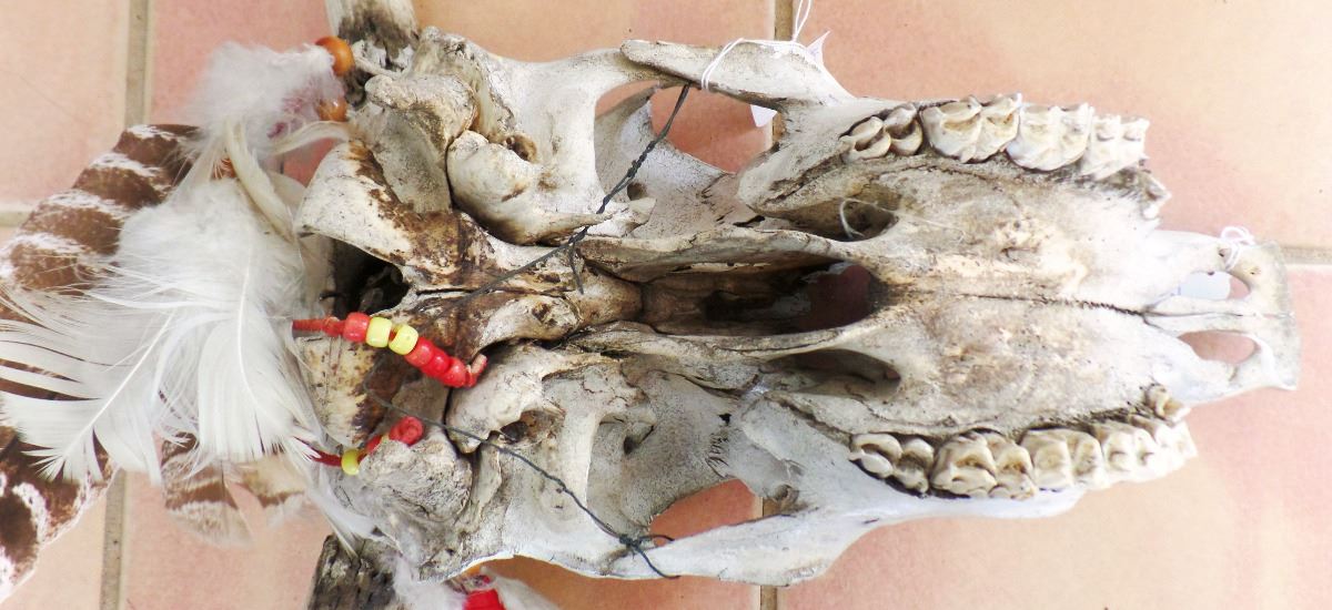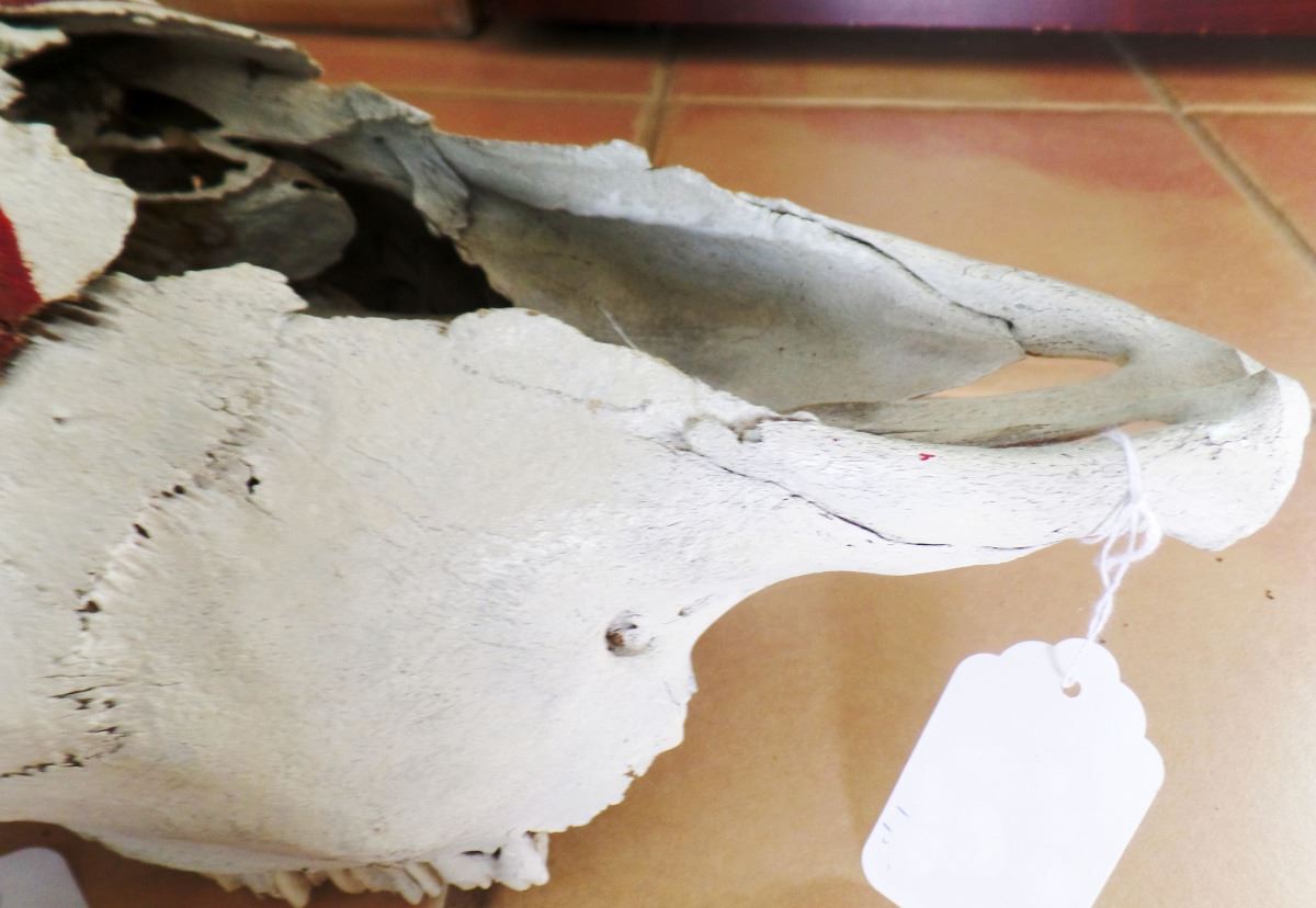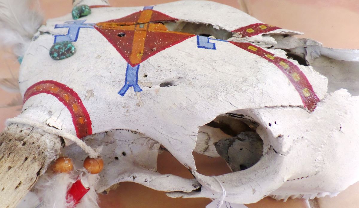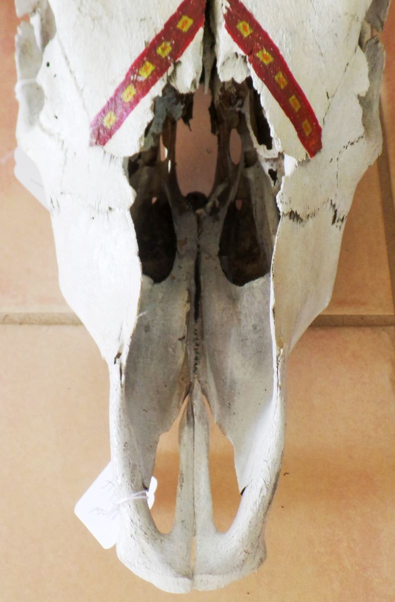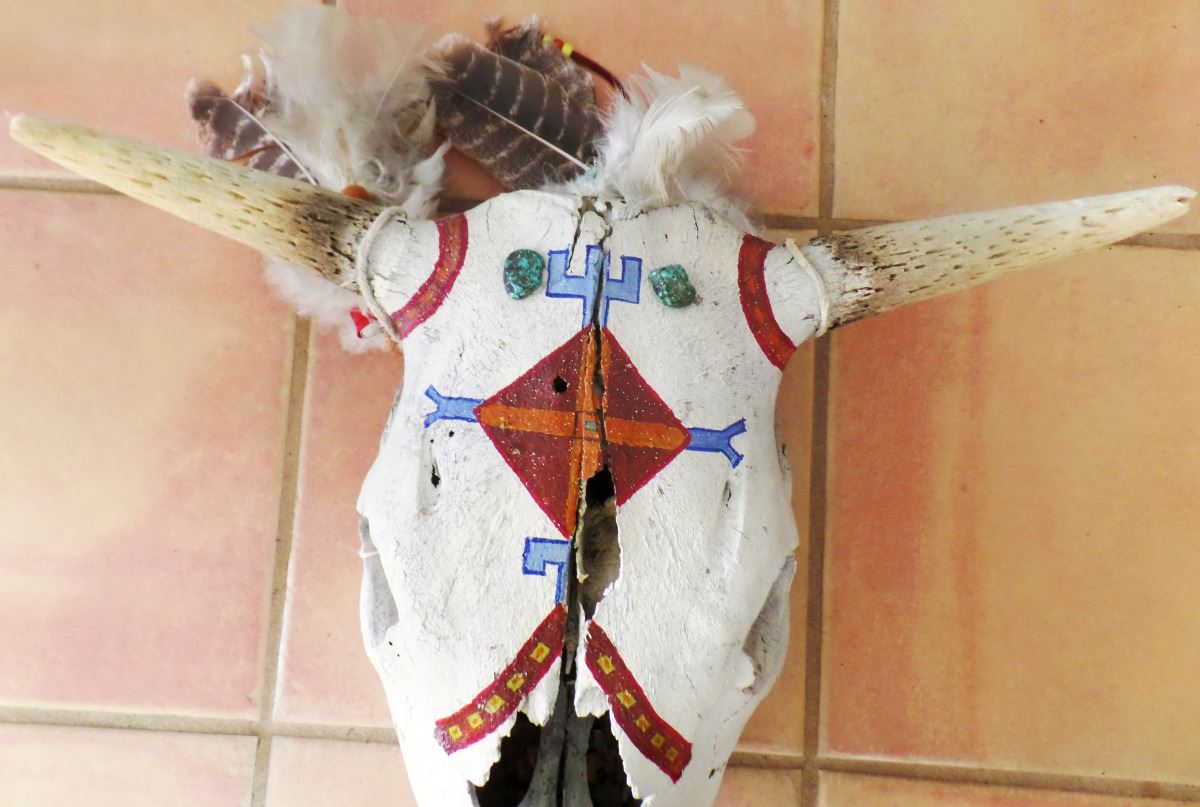 1970's painted steer skull with turquoise, feathers, paint and cow bone, possibly Apache Decorations. Conditions: There are some chips and cracks, see pictures. Shipping $50, requires double-box.
