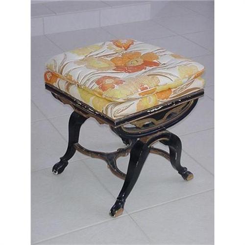 An early 20th century painted stool, 19 1/2" tall, 17 1/4" square. Painted black with gold trim the paint is in distressed condition, the streacher reach each of the stylized hoof feet part of which are missing and can easily be covered with black paint. A great looking stool, very decorative even in distressed condition. New upholstery will give it the look you want.