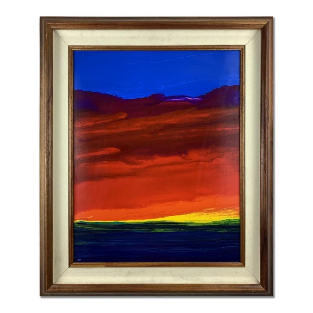 "Painted Sunset" is an original Original Painting painting on Board by Wyland that is hand signed and comes with a certificate of authenticity. The frame is imperfect with moderate wear. Measures approximately 22" x 26" (framed), 16" x 20" (image).