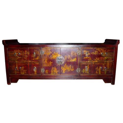 The artwork is a beautiful solid wood leather TV table with drawers made by hand from china,and possessing the typic style of Tibetan funiture.It is one of a large amount of Tibetan wood furnitures we have.These magnificent hand-painted lacquer wood furniture are crafted by a small group of Tibetan artisans bearing master technique .Each furniture is constructed of wood and then completely covered with lacquer outside. The piece boasts a flip-open top, with a brass handle or a brass clasp on the front which can be secured with a lock.The inside leather is meticulously hand-painted with various Chinese symbols and characters. The outside of the furniture is dyed dark red or black, then painted with hand a chinese landscape or personality picture using golden dye.The handcrafted nature of this product will produce slight variations in form and sizing.