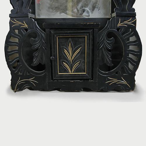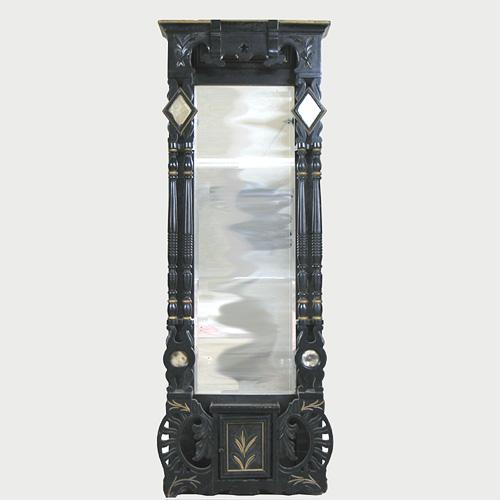 Painted Victorian hall rack; molded cornice with overhanging trim; double columns on each side of beveled mirror; applied and inlaid mirrors on columns; pierced trim flank single cabinet door on base; late 19th C.; 88" high x 32 1/2" across x 9" deep (some wear to edges of trim)