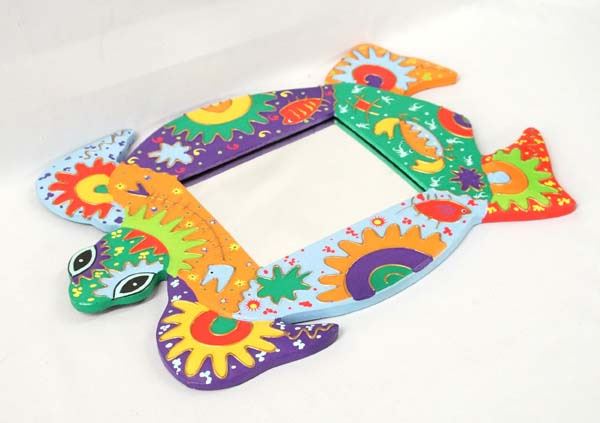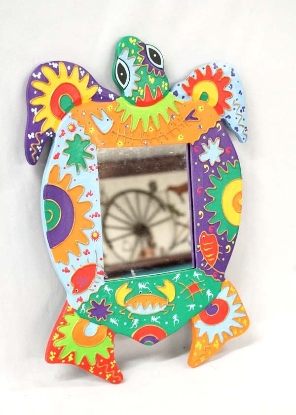 Painted Wood Turtle Mirror colorful and fun carved mirror is hand made in Bali, Indonesia. 15'' tall and 10'' wide.