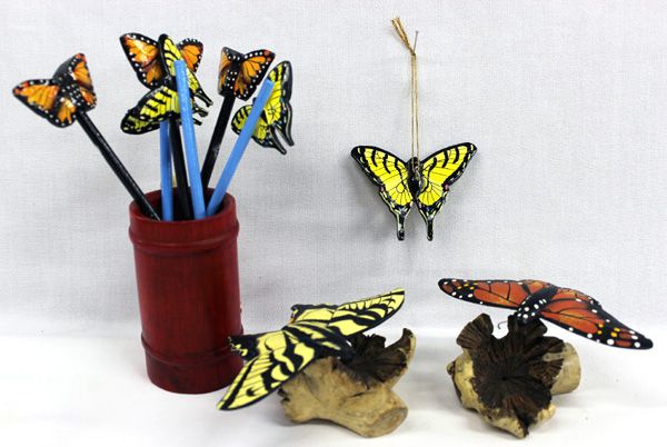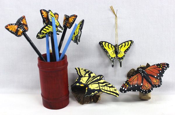 Painted Wooden Butterfly Collection. This assortment of Monarch and Swallowtail butterflies includes a small hanging ornament, pencils with wooden butterflies attached, a pencil holder with a clay painted lizard on the side, and 2 butterflies on Chinaberry wood burls. Items Measure Approx. (holder)4.75''Hx3''W, (Ornament) 2''H x 2.5''W and others 2.5''H x 5.5''W.