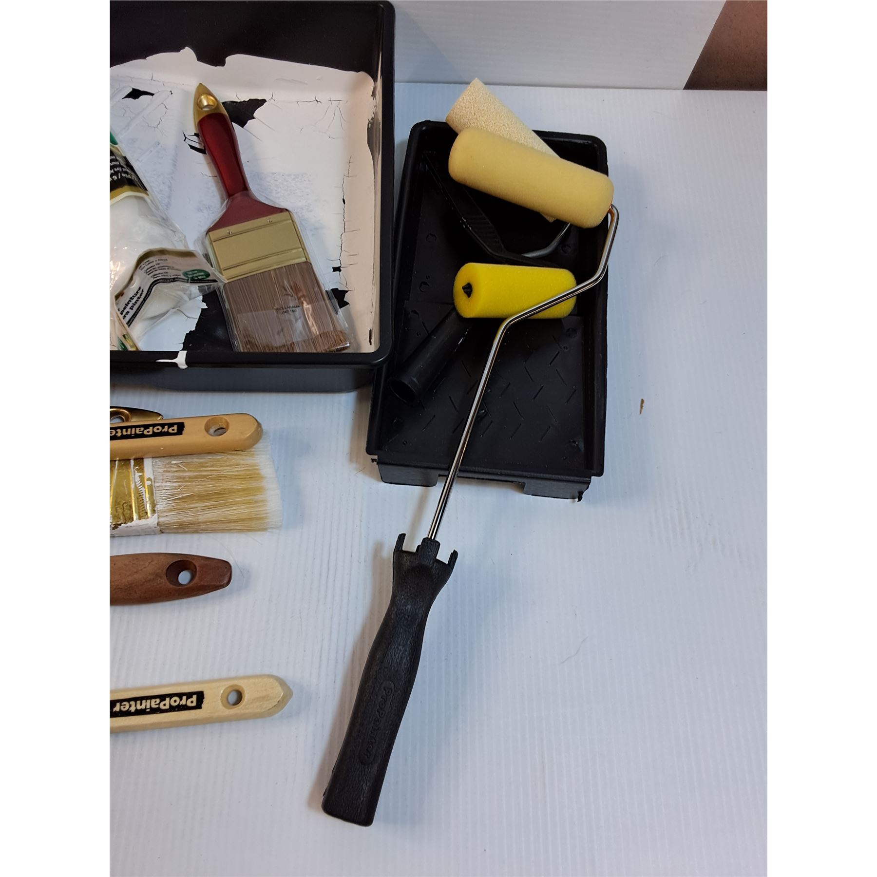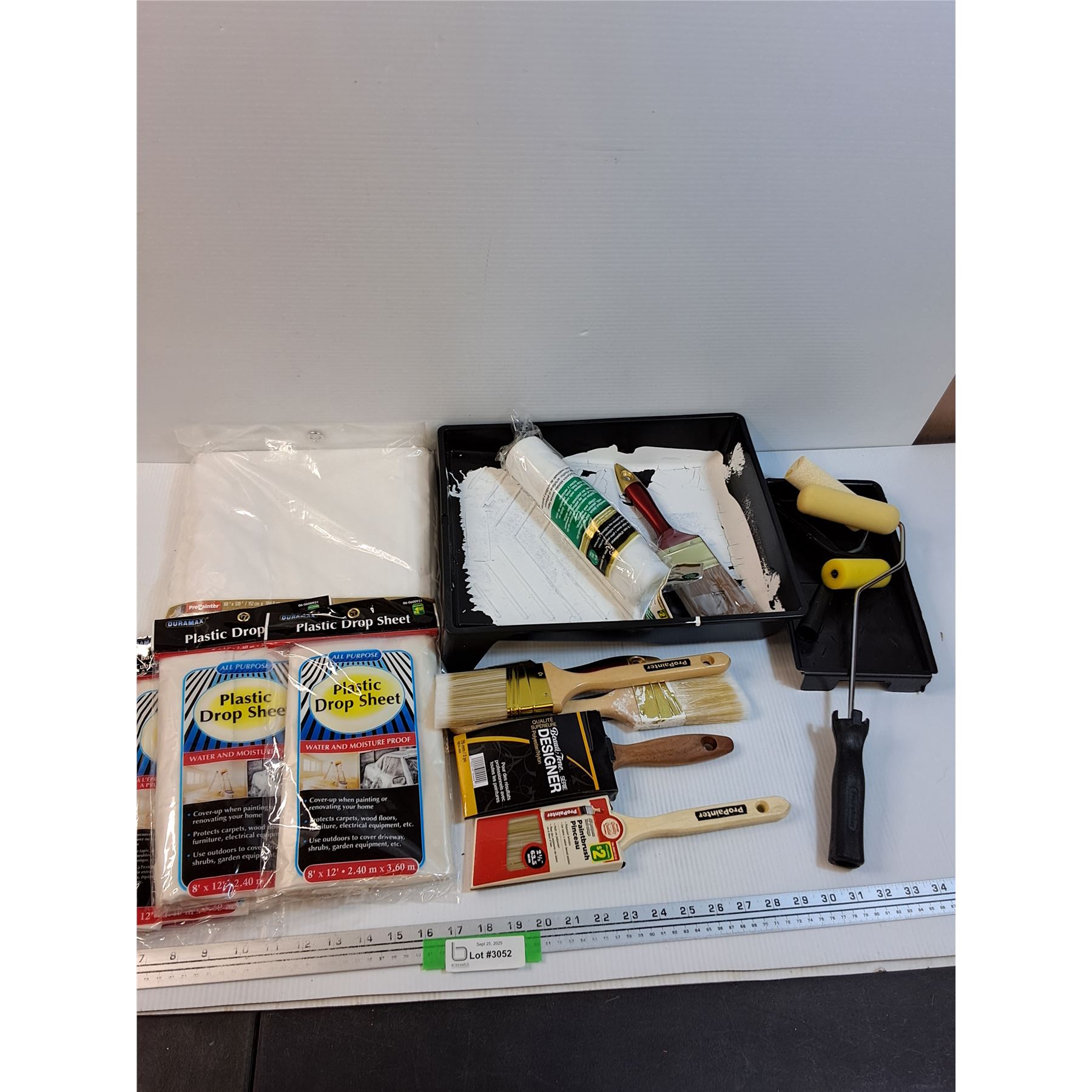 Painters Lot: Drop Cloth, Rollers, Paint Tray, Brushes, Misc