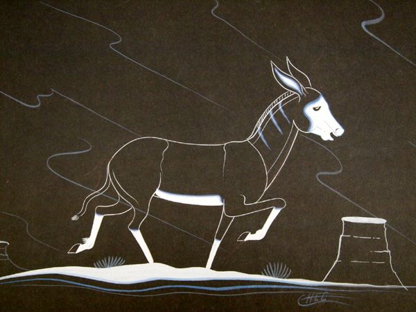 Painting ''Donkey Serenade'' - Native American Navajo Robert Chee. Original painting on dark artist board, matted, by Navajo artist, Robert Chee. Signed on lower right, ''CHEE''. It measures 11''x14'' (w/o mat).
