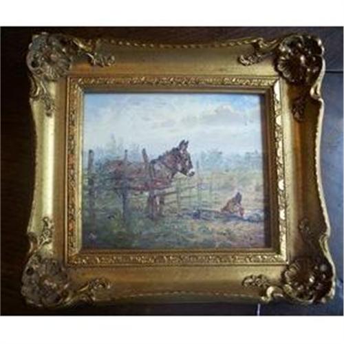 This is a quality John Mace oil painting. "John Mace is a well collected North Norfolk artist who paints in the best traditions of the Norwich School. He is keenly interested in wildlife and has had numerous exhibitions in the East Anglian area. His paintings are now much sought after and often portray Norfolk life in bygone times. Mace is a member of various art groups, including the Yarmouth and District Art Society. He can often be seen with his sketchbook rambling from field to field in the Norfolk countryside." (from prev. owner) This is a lovely small study of chickens and a donkey enjoying a peaceful summer evening. The image is 7" BY 6". The frame measures 10" BY 9".