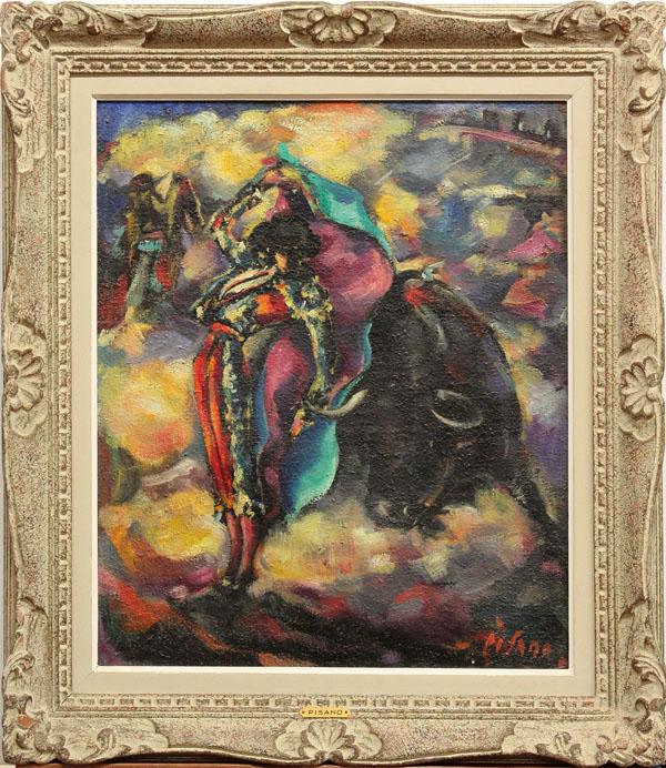 Framed oil on board, Matador and Bull, by Eduardo Pisano (Spanish, 1912-1986), signed ''E. Pisano'' lower right, sight: 21.25''h x 17.25''w, overall: 28.25''h x 24.75''w