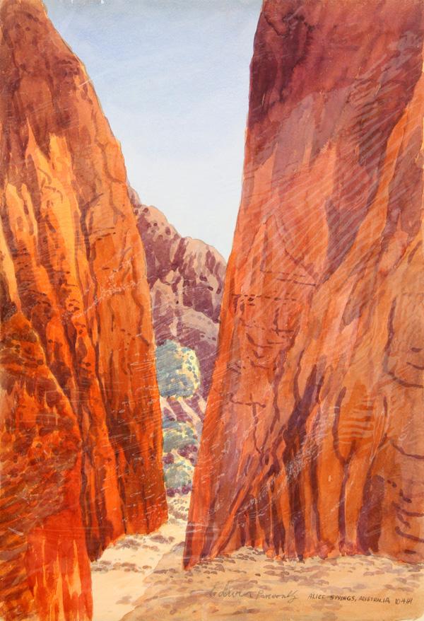 Unframed watercolor and pencil on board, ''Alice Springs, Australia,'' 1964, by Edwin Pareroultja (Australian, 1918-1986), signed and dated ''Edwin Pareroultja, 10-4-64'' lower right, overall: 21.75''h x 15''w