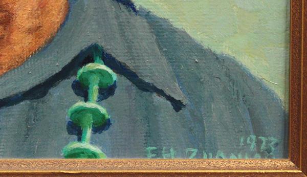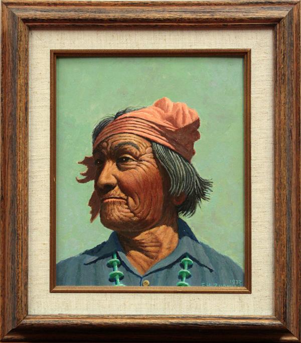 Oil on board, Man Wearing Turquoise Beads, 1973, by Frank Zuanich (Californian, 1890-1978), signed and dated lower right, board: 10.75''h x 9.5''w