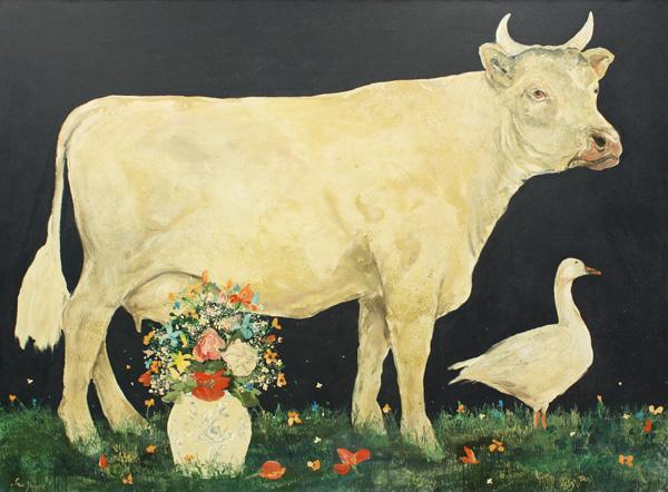 Unframed oil on canvas,''Cow and Goose,'' by Ira Yeager (Californian, b.1938), signed ''Ira Yeager'' lower left, overall: 65.75''h x 90.25''w