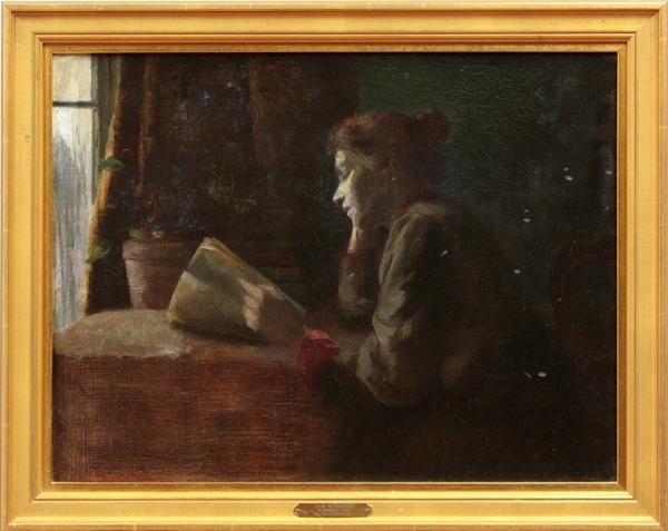 Framed oil on canvas, ''Woman Reading,'' by Jean Mannheim (German/American, 1863-1945), signed ''Jean Mannheim'' lower left, canvas: 16.5''h x 21.75''w. Provenance: Butterfield and Butterfield (June 1992)