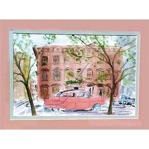Painting of NYC street with Federal brick house and fintail auto of same intense color. In this watercolor painting, by a woman artist, architectural details of the Federal handsome 1810 house are noteworthy. Antique auto buffs will enjoy the classic car. Vivid colors painted on ripple texture paper. NOT a print. Sight, 14x20 inches. Double matted and framed in silvered wood molding, 22-1/2x28-1/2 inches. This American nostalgic watercolor was painted by Rosannah Guilmette (1904-1987), sgn/dtd 1964. Guilmette was a student of the famous Raphael Soyer and followed his modernistic style. Art by American women painters is increasingly in demand.