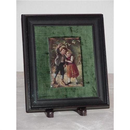 A lovely hand painted porcelain plaque, 9 1/2" X 11" shadow box frame with green velvet mat, the porcelain is 3 3/4" X 5 1/2". A very pretty painting of two children who seem to be lost in the woods, beautifully painted the plaque is signed "Wagner" in the lower right. The black frame may be original but it has been remounted and the velvet mat is relatively new. The glass is new glass.