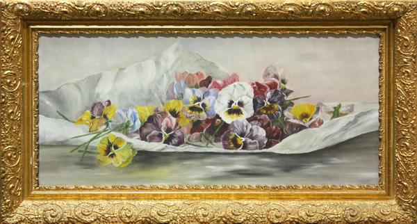 Framed oil on canvas, Still Life with Pansies, American School (20th century), unsigned, overall: 12.75''h x 23''w.