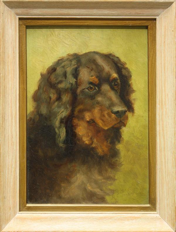 Framed oil on panel, Portrait of a Dog, American School (20th century), signed indistinctly (M.E. H _ _)lower right, overall:16.25''h x 12.25''w
