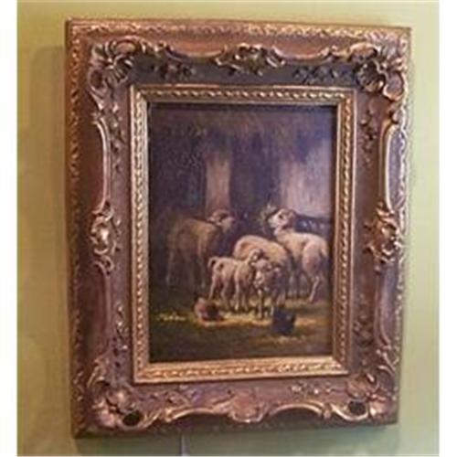 Offered here is a charming oil on board of sheep in a stable with chickens. It is framed in a baroque style frame. The painting is signed T. H. Hair and has a sticker on the back attributing the painting to Thomas H. Hair (1810-1882). There is also a German gallery label on the back. I do not support that attribution, I believe it is an early 20th century painting after Thomas Hair. The image measures 6.5" by 8.5". The frame measures 12" by 14". The painting is in very nice condition but does have some craqueleur in the upper left (should be visible in the picture).