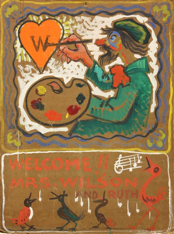 Unframed acrylic on cardboard ''Welcome!! Mrs Wilson -Ruth'', by Xavier Gonzales (Spanish/American, 1898-1993), overall: 39.5''h x 29.75''w