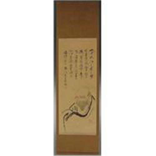 On his 89th birthday, the Zen monk Tatsumaro composed this reverential Zenga (Zen painting) of Daruma, the founder of Zen Buddhism. Simple flying white brushstrokes are used to outline the master's robe, while soft gray washes are lovingly applied to give us the details of Daruma's face. In the poem that accompanies the picture, Tatsumaro also pays tribute to Bosatsu and sings an ode to discipline. Mount: 57.5 x 16.5 inches, 146 x 42 cm. Painting: 33.5 x 14 inches, 85 x 36 cm