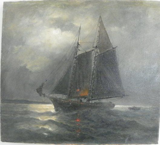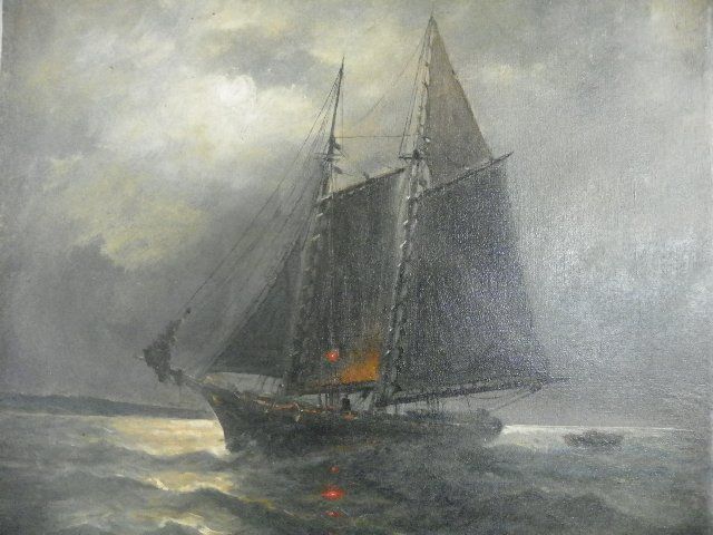 Oil on canvas "Schooner, Sailboat" Approx. 18" x 20". From a Harrison, NY estate. Please read our terms of sale.