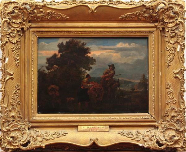 Framed oil on panel, A Shepherd and Shepherdess in a Pastoral Landscape,'' attributed to Nicolaes Berchem (Dutch, 1620-1683), bears signature lower left, panel: 9.5''h x 14''w. Provenance: Pawsey & Payne Gallery (London, UK)