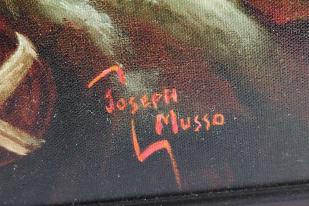 4' X 3' original oil on canvas. Depicting General George Armstrong Custer leading Calvary charge during the "Battle of Gettysburg". Signed by artist, Joseph Musso. Researched and expertly executed by Musso for his private collection. Painting also displayed by the University of the Arts Philadelphia, in the Silver star Exhibition. Valued at $35,000 for exhibition and receipt dates the work, 1977. Excellent condition. From the Joseph Musso Collection
