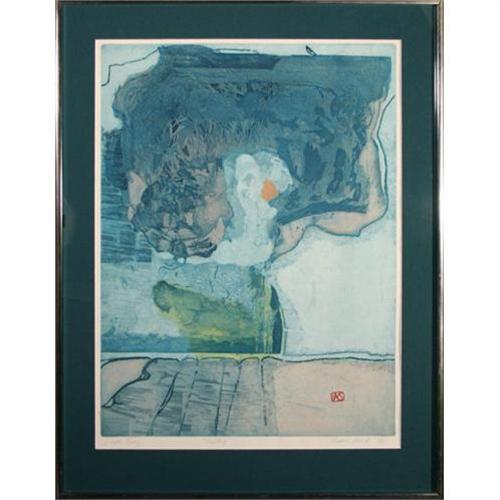 Working in several hues and shades of blue, renowned artist Slowik creates a wonderfully abstract and attractive work of art with her lithograph, entitled ?Painting?. Utilizing mainly blues, the artist uses her print making skills to create interesting textures and patterns within each color area which provide a truly unique feel. Creating attention with hints of additional colors such as yellow or orange, the lithograph has numerous focal points, allowing the viewer to enjoy this splendid piece in many areas. The piece measures in at 30.25? x 23.25?, and would make a great addition to your art collection or home décor. It is incredibly priced for such an original and authentic work of art.