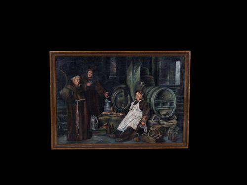 Painting depicting Monks in a Wine Cellar One Monk has had too much