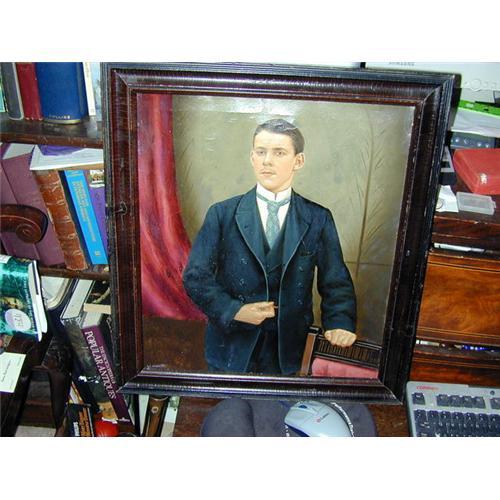 The painting is well executed and portrays a handsome young man with his hand on a Victorian chair. Red curtain to the side.
