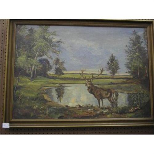 Framed outdoor painting of Deer by the lake. Appears to be Oil on canvas. Picture is signed by artist (lrh). Small dings in frame.
