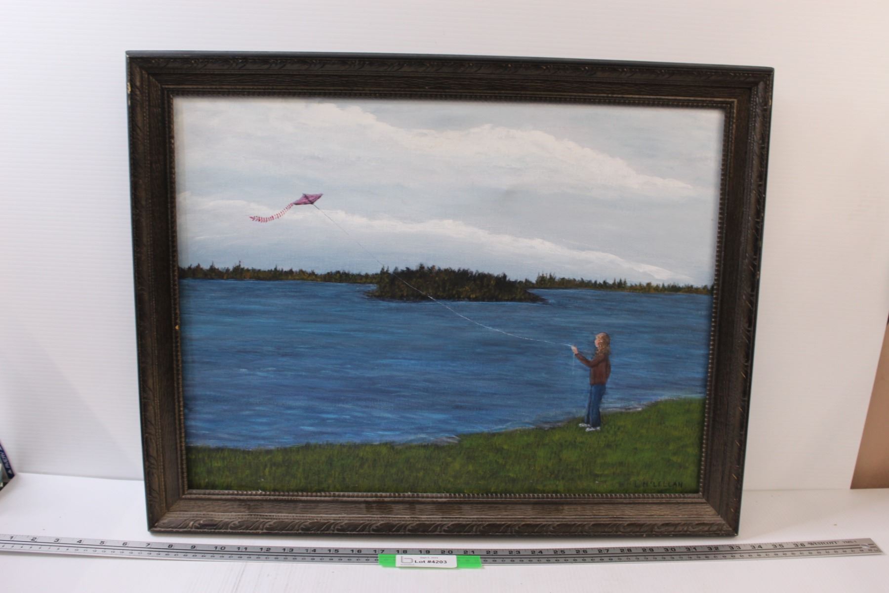 Painting of Girl Flying a Kite in Wood Frame - 21.5" x 27"