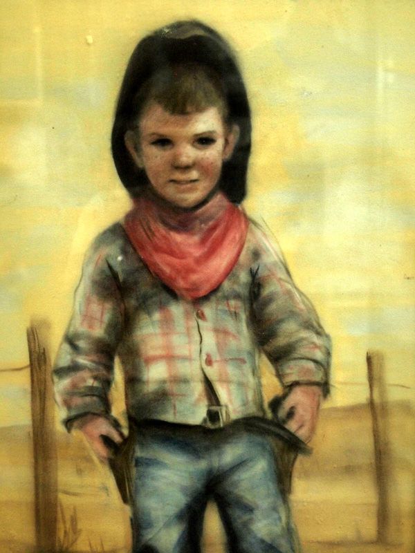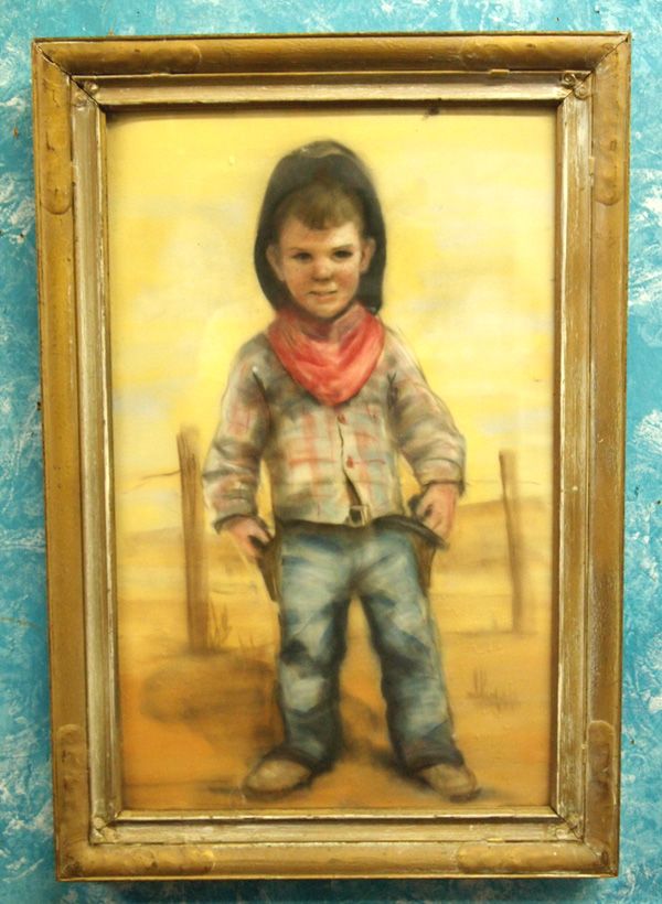 Painting of Young Cowboy-Gerda Christofferson. Original pastel painting of a darling youngster playing cowboy gunslinger. Hand written title on back says, ''quick draw.'' It is in a vintage wood frame and under glass. The visual measures 21.5''Hx13.5''W.