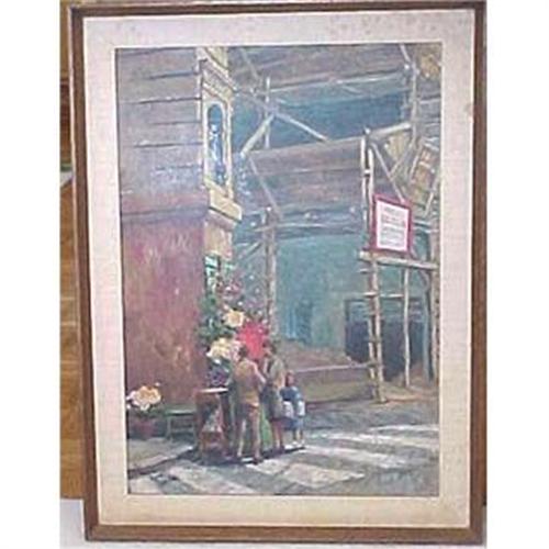 This is a post WW11 painting signed in the upper right corner. It depicts a woman and child buying flowers from a flower vender located under a church building being repaired. The faces are