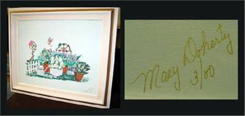 Painting of a garden on board. Measures 25" by 21 1/2" signed Mary Doherty 3/00