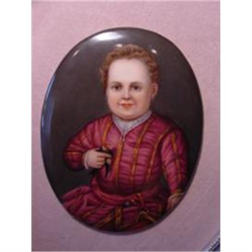 Wonderful antique painting on porcelain plaque depicting a child in 18th century attire