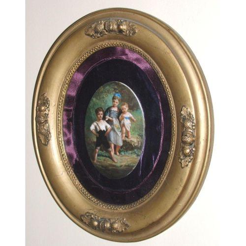 un-attributable. Possibly German. Late 19th century. Oil on porcelain. Depicting three young children all standing in a wooded setting. 6" high