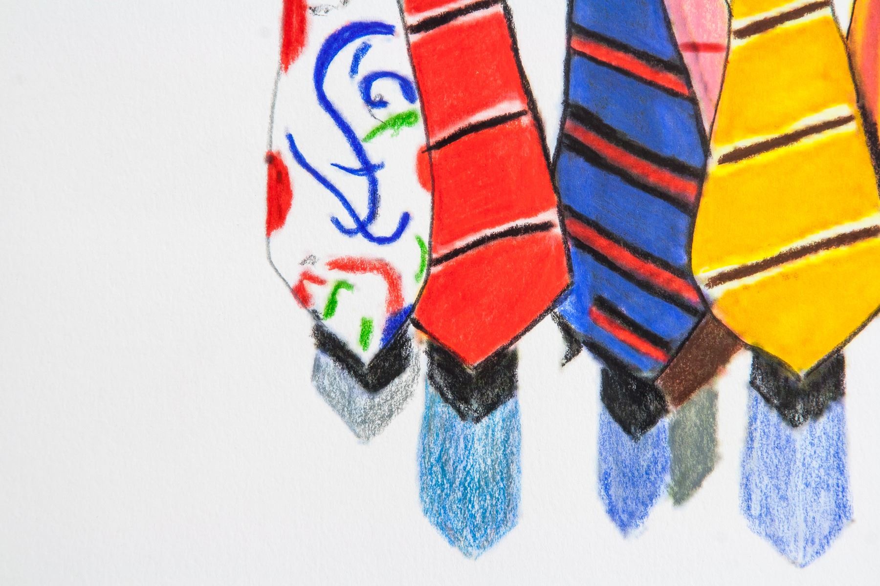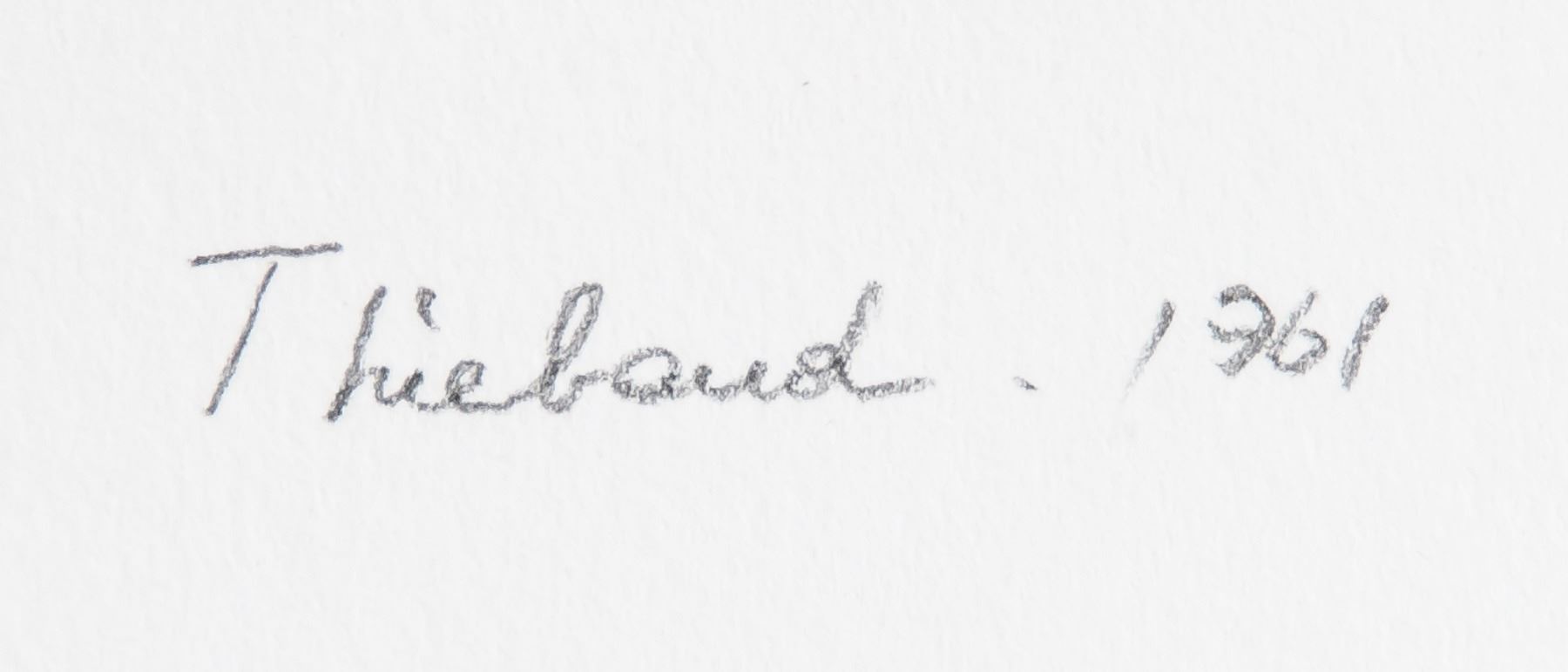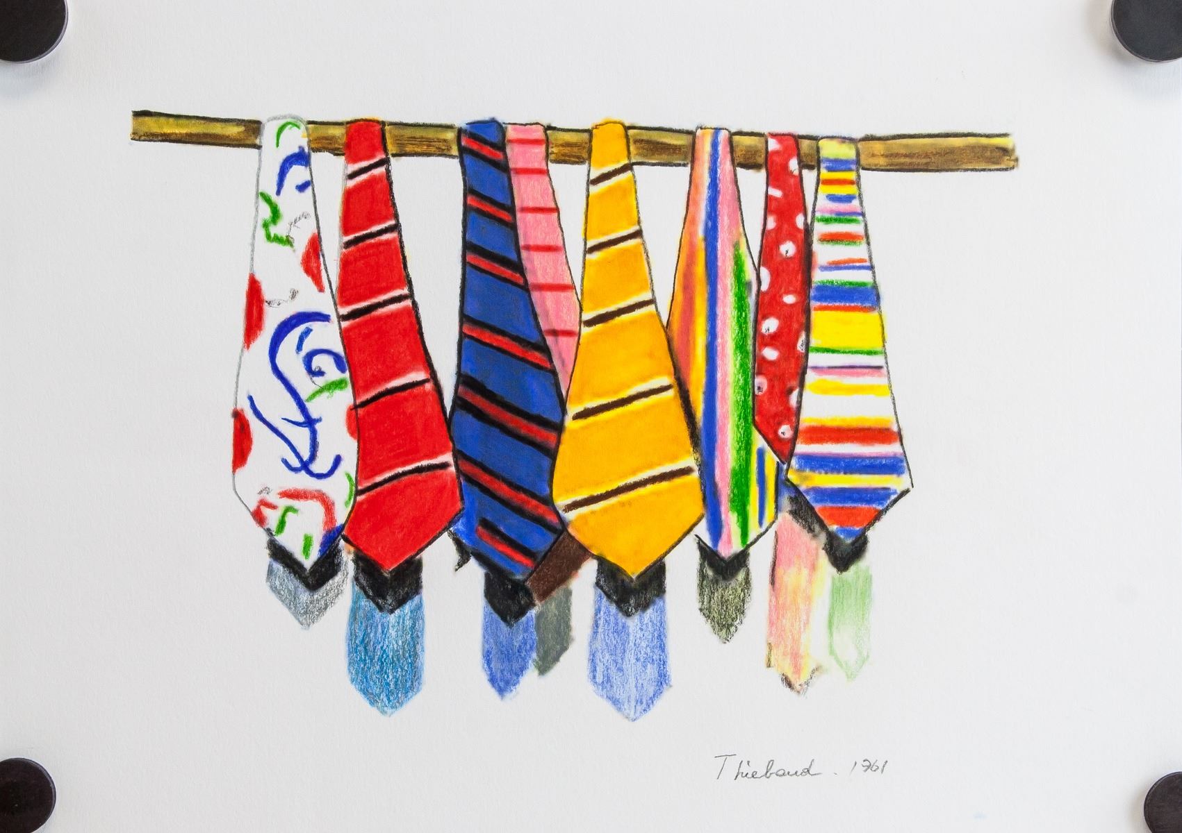 Crayon on paper, featuring colorful ties, signed Thiebaud and possible signature of Wayne Thiebaud on the lower right margin, inscribed 1961, 21 x 29 cm (8.3 x 11.4 inches). PROVENANCE: Upper New York estate.
