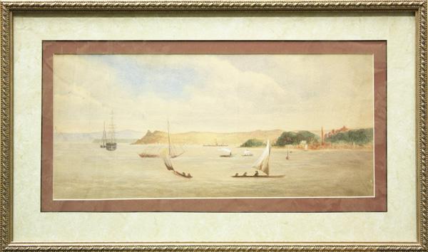 (lot of 2) Framed watercolors, In the Bay and Sunday Afternoon, American School (20th century) unsigned, largest overall: 11.75''h x 19.75''w