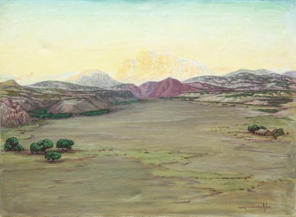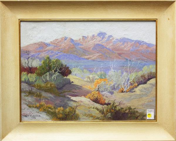 (Lot of 2) Framed pastel, Desert Landscape, 1959, signed and dated ''WB Turner '59'' lower left, and unframed oil on canvas, Cabin in the Desert Valley, 20th century, signed ''Eugene Sanford Upton'' lower right, largest overall: 24.5''h x 30.5''w
