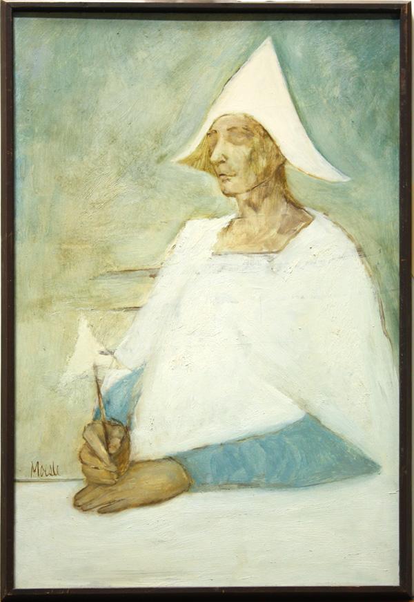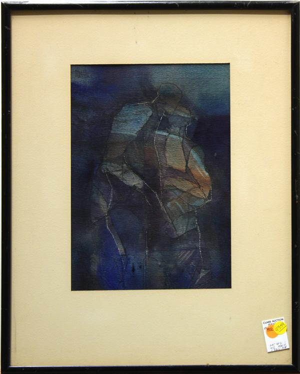 (Lot of 2) Framed oil on masonite and a framed watercolor, Figure in White with White Hat and Abstract Figures in Blue, by Robert Moesle (American, b. 1932), each signed ''Moesle'' lower and upper left, largest overall: 31.25''h x 21.25''w