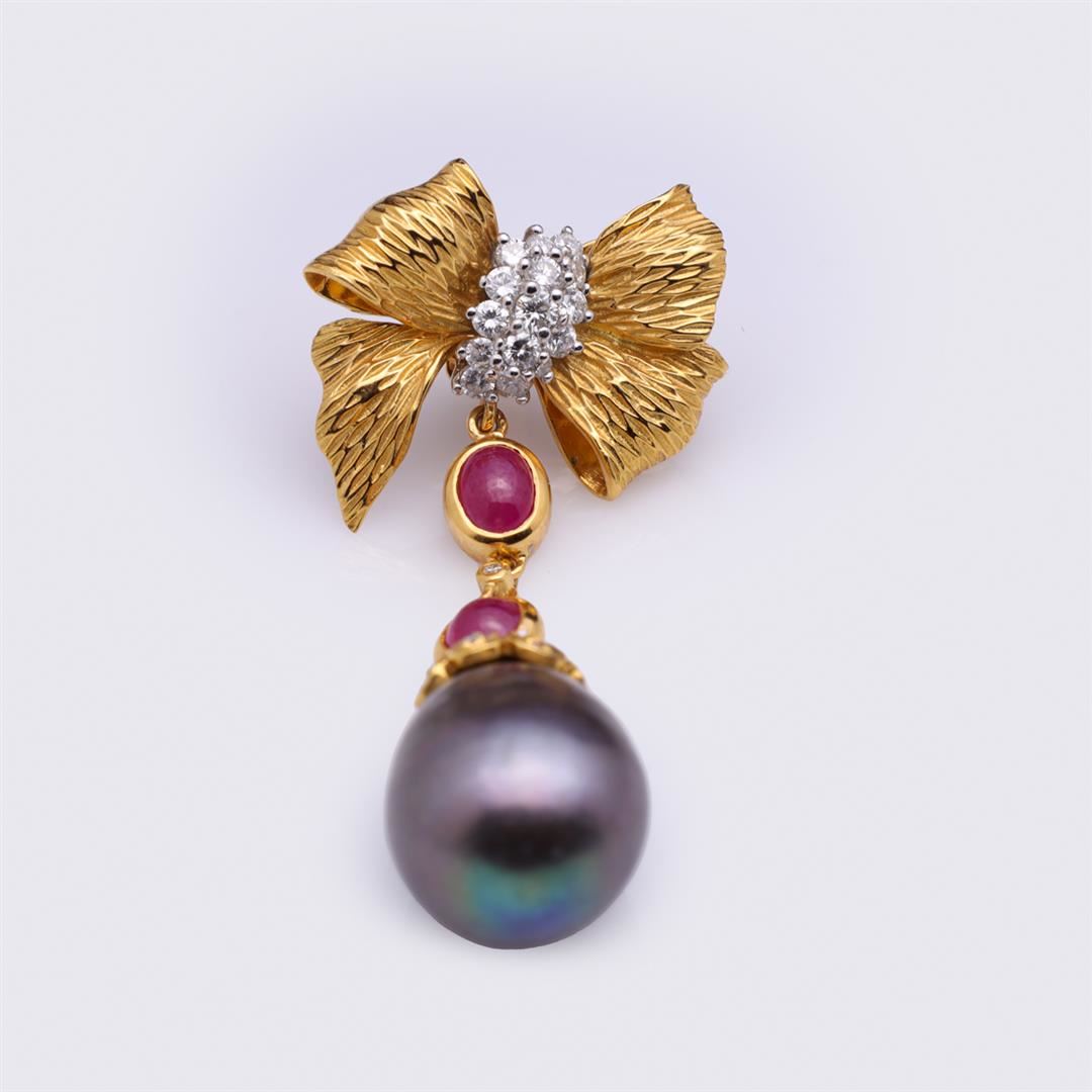 Pair 18K Yellow Gold, Ruby, Diamond & Pearl Earrings by Carlo Rici