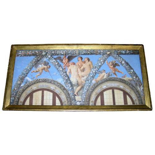 Depicted in each painting are two archways with three triangular panels above created by incredibly intricate garlands. In the first painting, the inverted triangular center panel features a winged male ( possibly the Roman god Mercury ), two females and a male with his back turned. On the right side is a cupid wielding a trident who's defending against bats and other animals, and on the left side is another cupid. In the second painting, the center panel features a seated female beside a winged male wielding an arrow, which may depict the Roman god Cupid ( son of Mercury and Venus ) and Psyche or possibly ...
