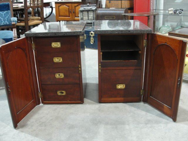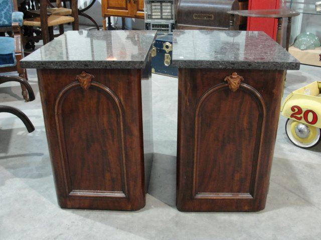 Pair 1940's End Tables w/Granite Tops. They were the pedestals of a desk converted into end tables. They have doors that open with drawers behind