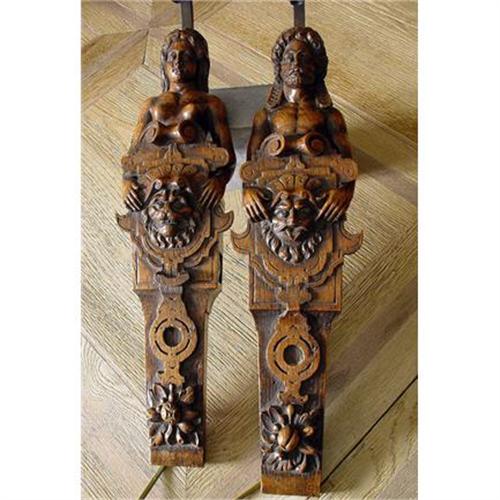 Handsome carved oak figural elements- Unusual pair of wall appliques</em></td>